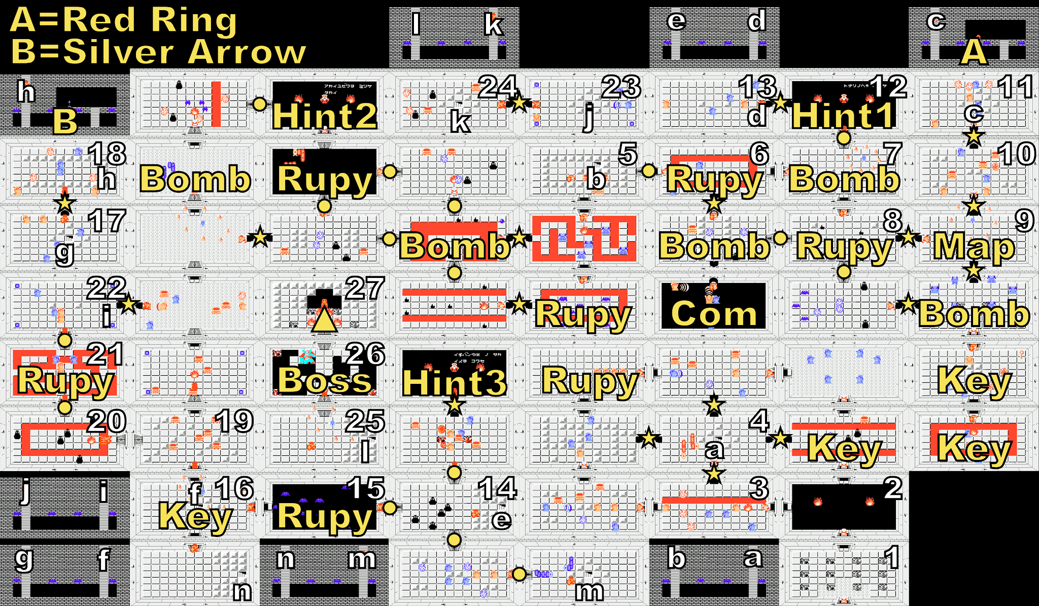 ※[Key=鍵] [Map=地図] [Com=コンパス] [Hint=ヒント] [Bomb=爆弾] [Rupy=ルピー] [Boss=ボス] [▲=トライフォースのかけら] [A=指輪[赤]] [B=銀の矢] [●=鍵付き扉] [a~c=階段] [★=爆弾で壊せる壁]